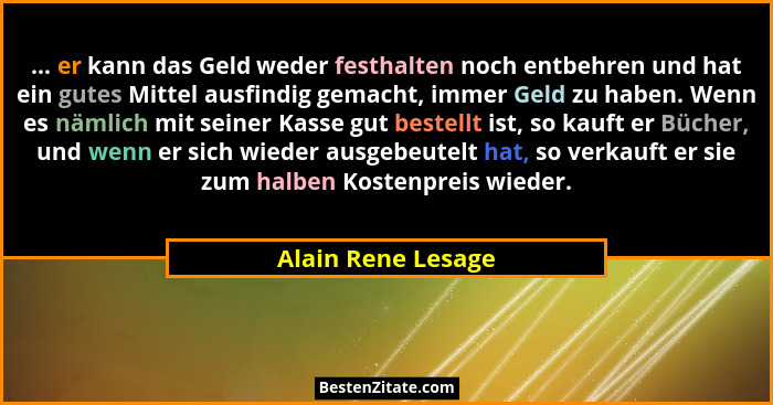 ... er kann das Geld weder festhalten noch entbehren und hat ein gutes Mittel ausfindig gemacht, immer Geld zu haben. Wenn es nämlich mit seiner Kasse gut bestellt ist, so kauft er Bücher, und wenn er sich wieder ausgebeutelt hat, so verkauft er sie zum halben Kostenpreis wieder.