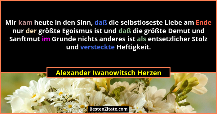 Mir kam heute in den Sinn, daß die selbstloseste Liebe am Ende nur der größte Egoismus ist und daß die größte Demut und Sanftmut im Grunde nichts anderes ist als entsetzlicher Stolz und versteckte Heftigkeit.