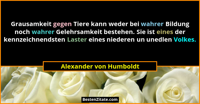 Grausamkeit gegen Tiere kann weder bei wahrer Bildung noch wahrer Gelehrsamkeit bestehen. Sie ist eines der kennzeichnendsten Laster eines niederen un unedlen Volkes.
