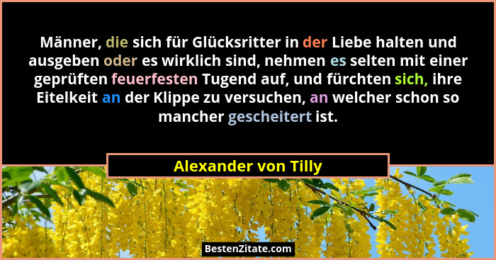 Männer, die sich für Glücksritter in der Liebe halten und ausgeben oder es wirklich sind, nehmen es selten mit einer geprüften feuerfesten Tugend auf, und fürchten sich, ihre Eitelkeit an der Klippe zu versuchen, an welcher schon so mancher gescheitert ist.