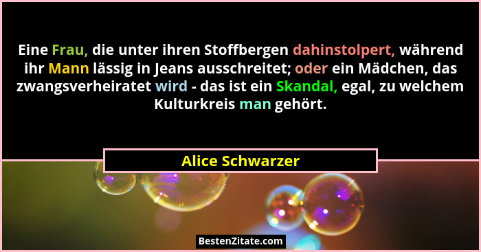 Eine Frau, die unter ihren Stoffbergen dahinstolpert, während ihr Mann lässig in Jeans ausschreitet; oder ein Mädchen, das zwangsverheiratet wird - das ist ein Skandal, egal, zu welchem Kulturkreis man gehört.