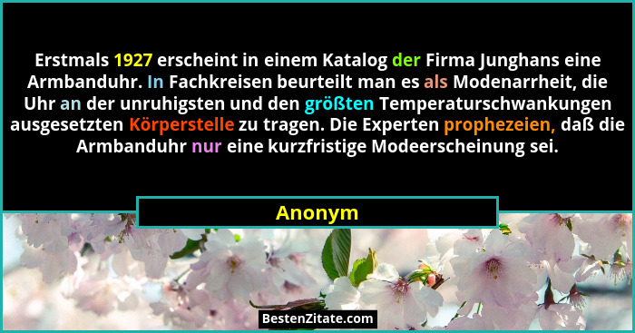 Erstmals 1927 erscheint in einem Katalog der Firma Junghans eine Armbanduhr. In Fachkreisen beurteilt man es als Modenarrheit, die Uhr an der unruhigsten und den größten Temperaturschwankungen ausgesetzten Körperstelle zu tragen. Die Experten prophezeien, daß die Armbanduhr nur eine kurzfristige Modeerscheinung sei.