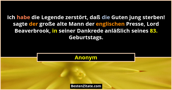 Ich habe die Legende zerstört, daß die Guten jung sterben! sagte der große alte Mann der englischen Presse, Lord Beaverbrook, in seiner Dankrede anläßlich seines 83. Geburtstags.