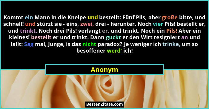 Kommt ein Mann in die Kneipe und bestellt: Fünf Pils, aber große bitte, und schnell! und stürzt sie - eins, zwei, drei - herunter. Noch vier Pils! bestellt er, und trinkt. Noch drei Pils! verlangt er, und trinkt. Noch ein Pils! Aber ein kleines! bestellt er und trinkt. Dann guckt er den Wirt resigniert an und lallt: Sag mal, Junge, is das nicht paradox? Je weniger ich trinke, um so besoffener werd' ich!