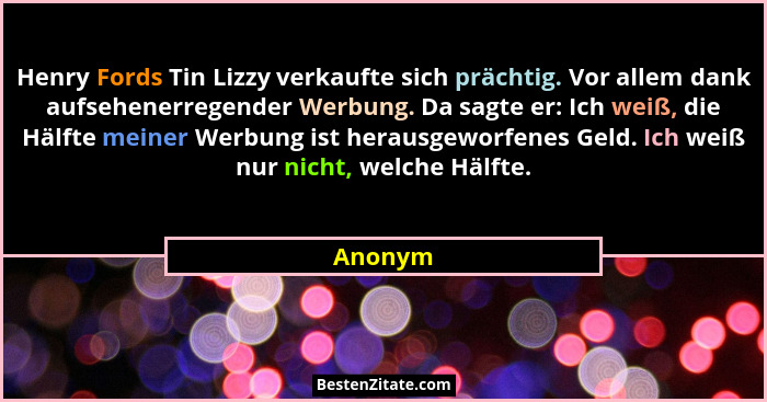 Henry Fords Tin Lizzy verkaufte sich prächtig. Vor allem dank aufsehenerregender Werbung. Da sagte er: Ich weiß, die Hälfte meiner Werbung ist herausgeworfenes Geld. Ich weiß nur nicht, welche Hälfte.