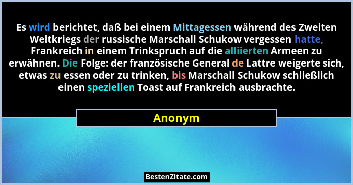 Es wird berichtet, daß bei einem Mittagessen während des Zweiten Weltkriegs der russische Marschall Schukow vergessen hatte, Frankreich in einem Trinkspruch auf die alliierten Armeen zu erwähnen. Die Folge: der französische General de Lattre weigerte sich, etwas zu essen oder zu trinken, bis Marschall Schukow schließlich einen speziellen Toast auf Frankreich ausbrachte.