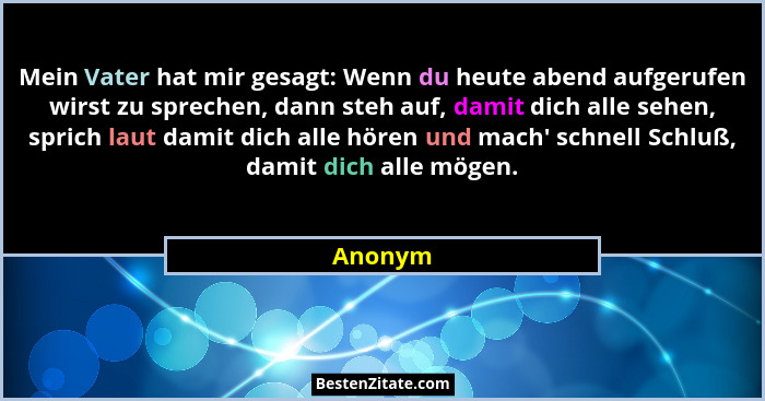 Mein Vater hat mir gesagt: Wenn du heute abend aufgerufen wirst zu sprechen, dann steh auf, damit dich alle sehen, sprich laut damit dich alle hören und mach' schnell Schluß, damit dich alle mögen.