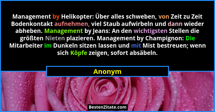 Management by Helikopter: Über alles schweben, von Zeit zu Zeit Bodenkontakt aufnehmen, viel Staub aufwirbeln und dann wieder abheben. Management by Jeans: An den wichtigsten Stellen die größten Nieten plazieren. Management by Champignon: Die Mitarbeiter im Dunkeln sitzen lassen und mit Mist bestreuen; wenn sich Köpfe zeigen, sofort absäbeln.