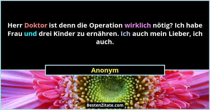 Herr Doktor ist denn die Operation wirklich nötig? Ich habe Frau und drei Kinder zu ernähren. Ich auch mein Lieber, ich auch.