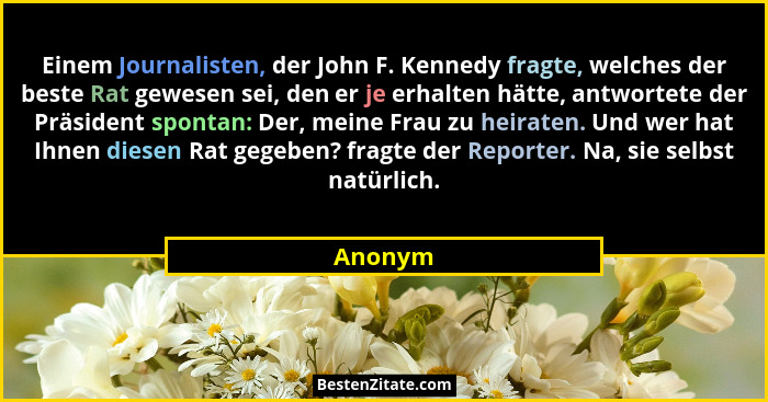 Einem Journalisten, der John F. Kennedy fragte, welches der beste Rat gewesen sei, den er je erhalten hätte, antwortete der Präsident spontan: Der, meine Frau zu heiraten. Und wer hat Ihnen diesen Rat gegeben? fragte der Reporter. Na, sie selbst natürlich.