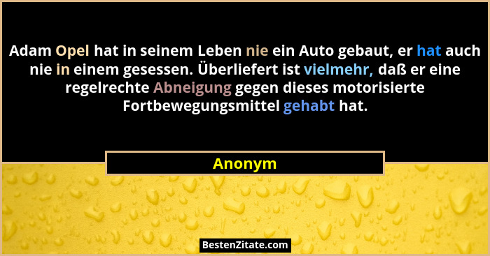 Adam Opel hat in seinem Leben nie ein Auto gebaut, er hat auch nie in einem gesessen. Überliefert ist vielmehr, daß er eine regelrechte Abneigung gegen dieses motorisierte Fortbewegungsmittel gehabt hat.