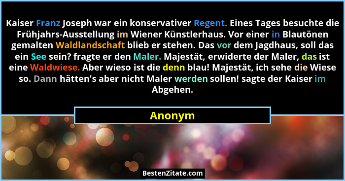 Kaiser Franz Joseph war ein konservativer Regent. Eines Tages besuchte die Frühjahrs-Ausstellung im Wiener Künstlerhaus. Vor einer in Blautönen gemalten Waldlandschaft blieb er stehen. Das vor dem Jagdhaus, soll das ein See sein? fragte er den Maler. Majestät, erwiderte der Maler, das ist eine Waldwiese. Aber wieso ist die denn blau! Majestät, ich sehe die Wiese so. Dann hätten's aber nicht Maler werden sollen! sagte der Kaiser im Abgehen.