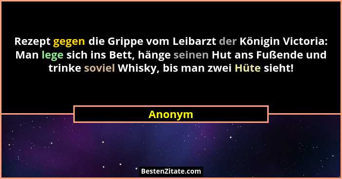 Rezept gegen die Grippe vom Leibarzt der Königin Victoria: Man lege sich ins Bett, hänge seinen Hut ans Fußende und trinke soviel Whisky, bis man zwei Hüte sieht!