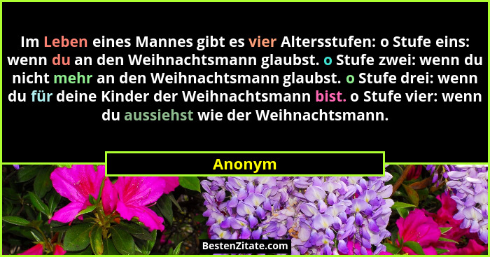 Im Leben eines Mannes gibt es vier Altersstufen: o Stufe eins: wenn du an den Weihnachtsmann glaubst. o Stufe zwei: wenn du nicht mehr an den Weihnachtsmann glaubst. o Stufe drei: wenn du für deine Kinder der Weihnachtsmann bist. o Stufe vier: wenn du aussiehst wie der Weihnachtsmann.