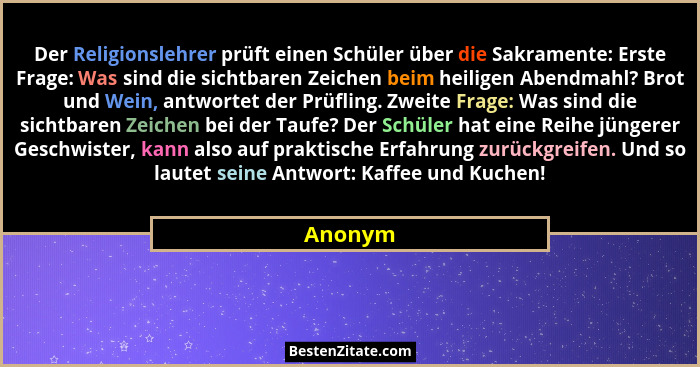 Der Religionslehrer prüft einen Schüler über die Sakramente: Erste Frage: Was sind die sichtbaren Zeichen beim heiligen Abendmahl? Brot und Wein, antwortet der Prüfling. Zweite Frage: Was sind die sichtbaren Zeichen bei der Taufe? Der Schüler hat eine Reihe jüngerer Geschwister, kann also auf praktische Erfahrung zurückgreifen. Und so lautet seine Antwort: Kaffee und Kuchen!