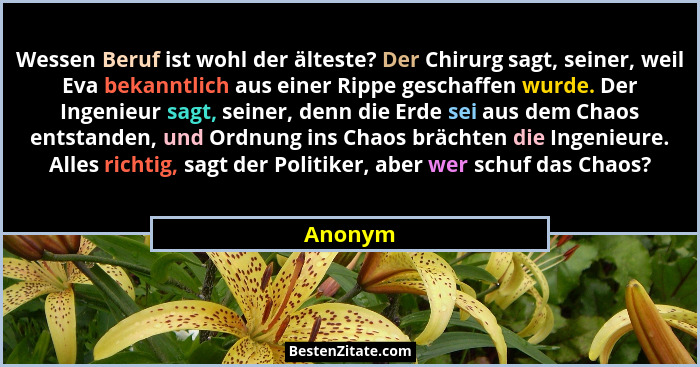 Wessen Beruf ist wohl der älteste? Der Chirurg sagt, seiner, weil Eva bekanntlich aus einer Rippe geschaffen wurde. Der Ingenieur sagt, seiner, denn die Erde sei aus dem Chaos entstanden, und Ordnung ins Chaos brächten die Ingenieure. Alles richtig, sagt der Politiker, aber wer schuf das Chaos?