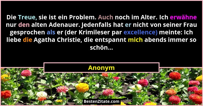 Die Treue, sie ist ein Problem. Auch noch im Alter. Ich erwähne nur den alten Adenauer. Jedenfalls hat er nicht von seiner Frau gesprochen als er (der Krimileser par excellence) meinte: Ich liebe die Agatha Christie, die entspannt mich abends immer so schön...