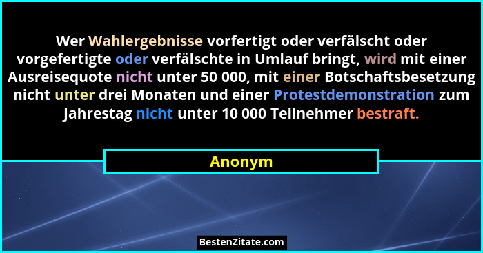 Wer Wahlergebnisse vorfertigt oder verfälscht oder vorgefertigte oder verfälschte in Umlauf bringt, wird mit einer Ausreisequote nicht unter 50 000, mit einer Botschaftsbesetzung nicht unter drei Monaten und einer Protestdemonstration zum Jahrestag nicht unter 10 000 Teilnehmer bestraft.