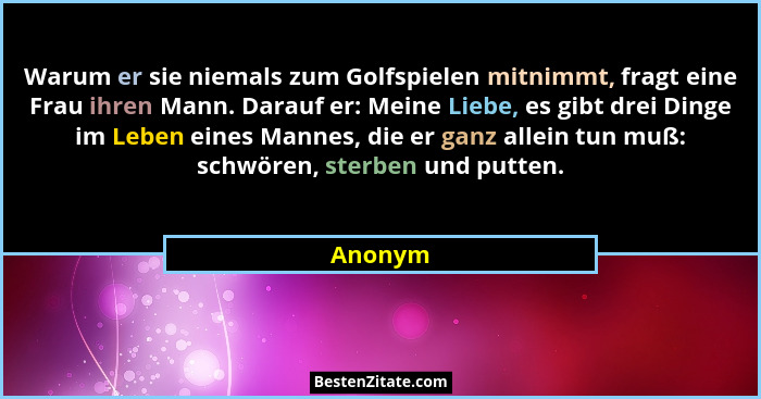 Warum er sie niemals zum Golfspielen mitnimmt, fragt eine Frau ihren Mann. Darauf er: Meine Liebe, es gibt drei Dinge im Leben eines Mannes, die er ganz allein tun muß: schwören, sterben und putten.