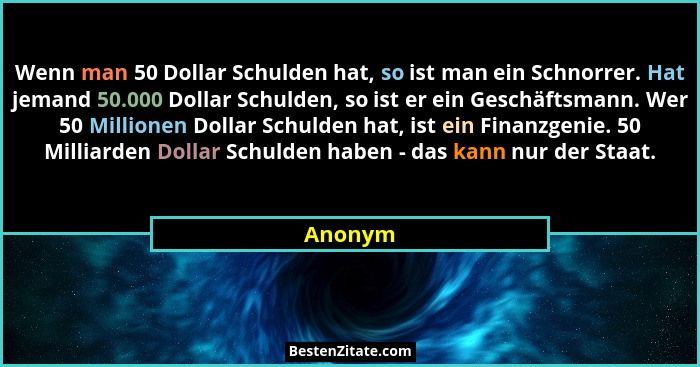 Wenn man 50 Dollar Schulden hat, so ist man ein Schnorrer. Hat jemand 50.000 Dollar Schulden, so ist er ein Geschäftsmann. Wer 50 Millionen Dollar Schulden hat, ist ein Finanzgenie. 50 Milliarden Dollar Schulden haben - das kann nur der Staat.
