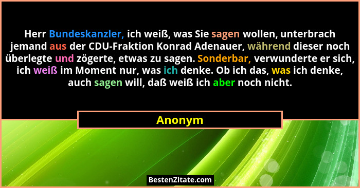 Herr Bundeskanzler, ich weiß, was Sie sagen wollen, unterbrach jemand aus der CDU-Fraktion Konrad Adenauer, während dieser noch überlegte und zögerte, etwas zu sagen. Sonderbar, verwunderte er sich, ich weiß im Moment nur, was ich denke. Ob ich das, was ich denke, auch sagen will, daß weiß ich aber noch nicht.