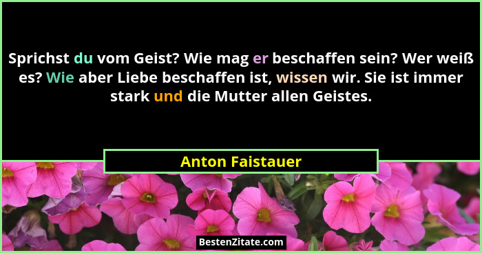 Sprichst du vom Geist? Wie mag er beschaffen sein? Wer weiß es? Wie aber Liebe beschaffen ist, wissen wir. Sie ist immer stark und die Mutter allen Geistes.