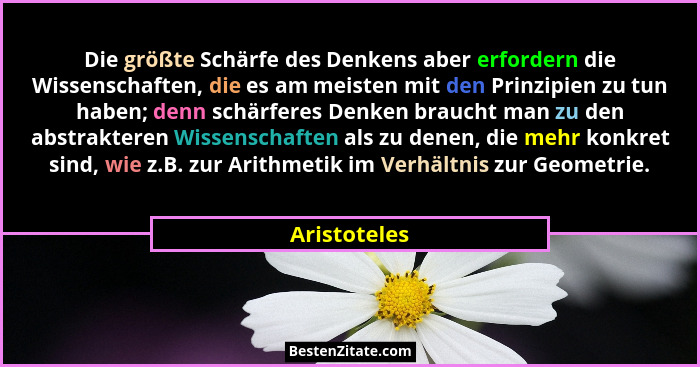 Die größte Schärfe des Denkens aber erfordern die Wissenschaften, die es am meisten mit den Prinzipien zu tun haben; denn schärferes Den... - Aristoteles