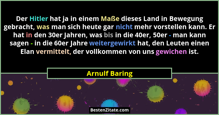 Der Hitler hat ja in einem Maße dieses Land in Bewegung gebracht, was man sich heute gar nicht mehr vorstellen kann. Er hat in den 30er Jahren, was bis in die 40er, 50er - man kann sagen - in die 60er Jahre weitergewirkt hat, den Leuten einen Elan vermittelt, der vollkommen von uns gewichen ist.