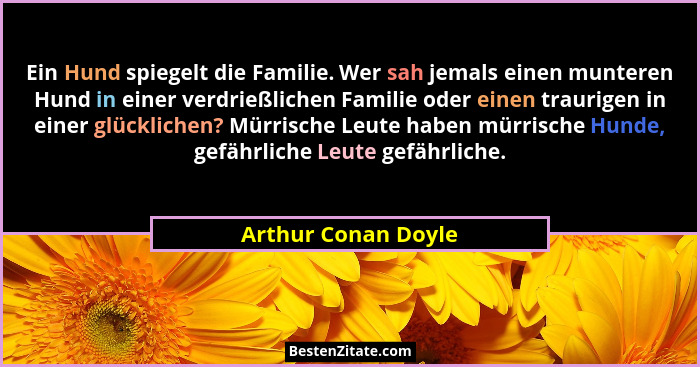 Ein Hund spiegelt die Familie. Wer sah jemals einen munteren Hund in einer verdrießlichen Familie oder einen traurigen in einer glücklichen? Mürrische Leute haben mürrische Hunde, gefährliche Leute gefährliche.