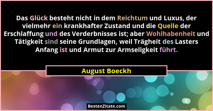 Das Glück besteht nicht in dem Reichtum und Luxus, der vielmehr ein krankhafter Zustand und die Quelle der Erschlaffung und des Verderbnisses ist; aber Wohlhabenheit und Tätigkeit sind seine Grundlagen, weil Trägheit des Lasters Anfang ist und Armut zur Armseligkeit führt.