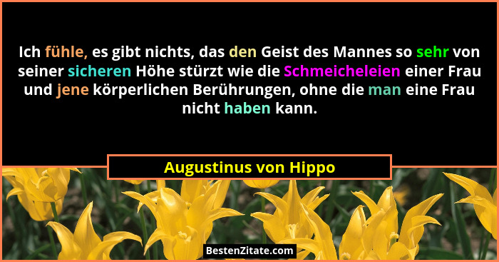Ich fühle, es gibt nichts, das den Geist des Mannes so sehr von seiner sicheren Höhe stürzt wie die Schmeicheleien einer Frau und jene körperlichen Berührungen, ohne die man eine Frau nicht haben kann.