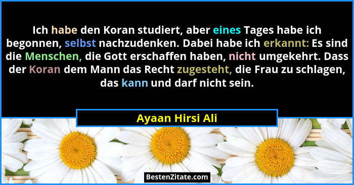 Ich habe den Koran studiert, aber eines Tages habe ich begonnen, selbst nachzudenken. Dabei habe ich erkannt: Es sind die Menschen, die Gott erschaffen haben, nicht umgekehrt. Dass der Koran dem Mann das Recht zugesteht, die Frau zu schlagen, das kann und darf nicht sein.