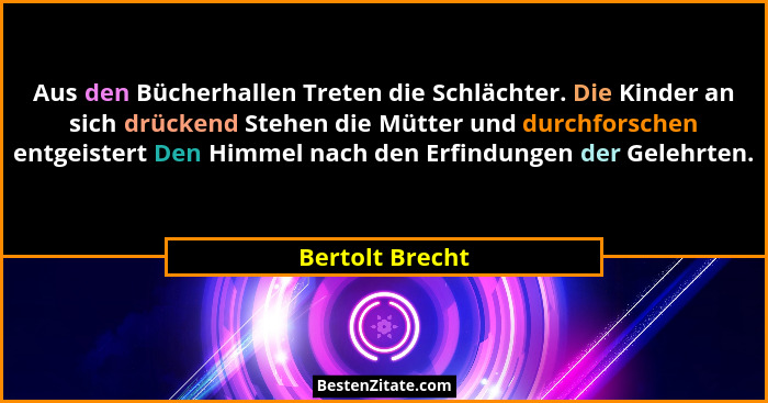 Aus den Bücherhallen Treten die Schlächter. Die Kinder an sich drückend Stehen die Mütter und durchforschen entgeistert Den Himmel nach den Erfindungen der Gelehrten.