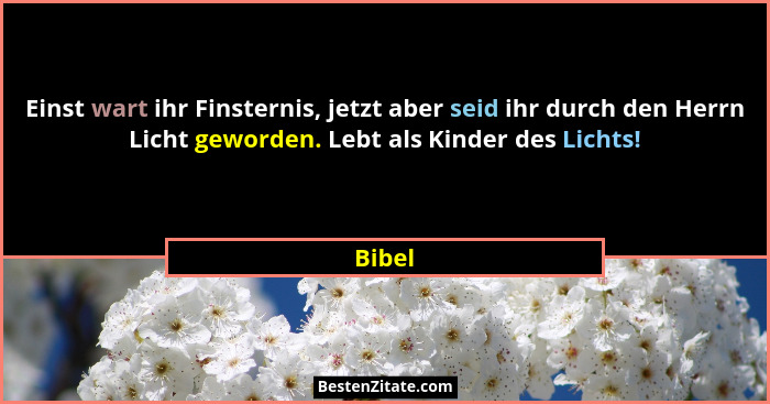Einst wart ihr Finsternis, jetzt aber seid ihr durch den Herrn Licht geworden. Lebt als Kinder des Lichts!