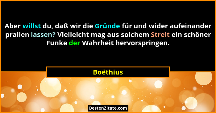 Aber willst du, daß wir die Gründe für und wider aufeinander prallen lassen? Vielleicht mag aus solchem Streit ein schöner Funke der Wahrheit hervorspringen.