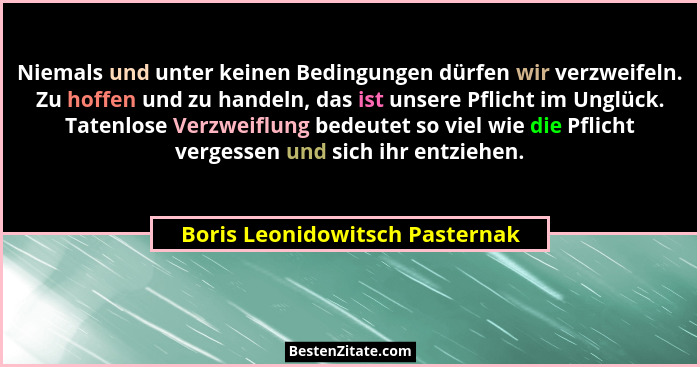 Niemals und unter keinen Bedingungen dürfen wir verzweifeln. Zu hoffen und zu handeln, das ist unsere Pflicht im Unglück. Tatenlose Verzweiflung bedeutet so viel wie die Pflicht vergessen und sich ihr entziehen.