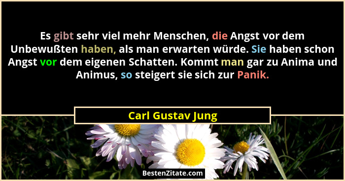 Es gibt sehr viel mehr Menschen, die Angst vor dem Unbewußten haben, als man erwarten würde. Sie haben schon Angst vor dem eigenen Schatten. Kommt man gar zu Anima und Animus, so steigert sie sich zur Panik.