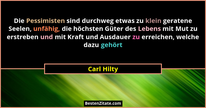 Die Pessimisten sind durchweg etwas zu klein geratene Seelen, unfähig, die höchsten Güter des Lebens mit Mut zu erstreben und mit Kraft und Ausdauer zu erreichen, welche dazu gehört