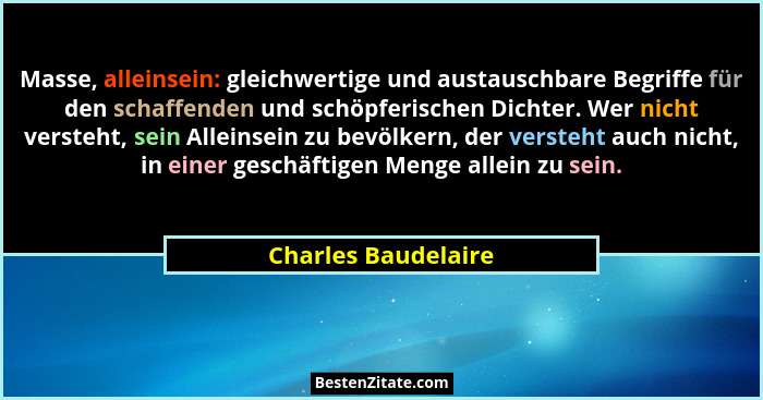 Masse, alleinsein: gleichwertige und austauschbare Begriffe für den schaffenden und schöpferischen Dichter. Wer nicht versteht, sein Alleinsein zu bevölkern, der versteht auch nicht, in einer geschäftigen Menge allein zu sein.