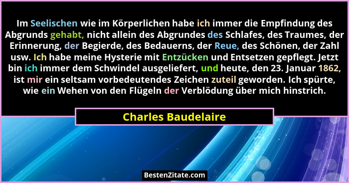 Im Seelischen wie im Körperlichen habe ich immer die Empfindung des Abgrunds gehabt, nicht allein des Abgrundes des Schlafes, des Traumes, der Erinnerung, der Begierde, des Bedauerns, der Reue, des Schönen, der Zahl usw. Ich habe meine Hysterie mit Entzücken und Entsetzen gepflegt. Jetzt bin ich immer dem Schwindel ausgeliefert, und heute, den 23. Januar 1862, ist mir ein seltsam vorbedeutendes Zeichen zuteil geworden. Ich spürte, wie ein Wehen von den Flügeln der Verblödung über mich hinstrich.