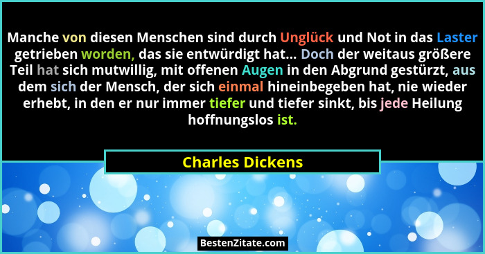 Manche von diesen Menschen sind durch Unglück und Not in das Laster getrieben worden, das sie entwürdigt hat... Doch der weitaus größere Teil hat sich mutwillig, mit offenen Augen in den Abgrund gestürzt, aus dem sich der Mensch, der sich einmal hineinbegeben hat, nie wieder erhebt, in den er nur immer tiefer und tiefer sinkt, bis jede Heilung hoffnungslos ist.