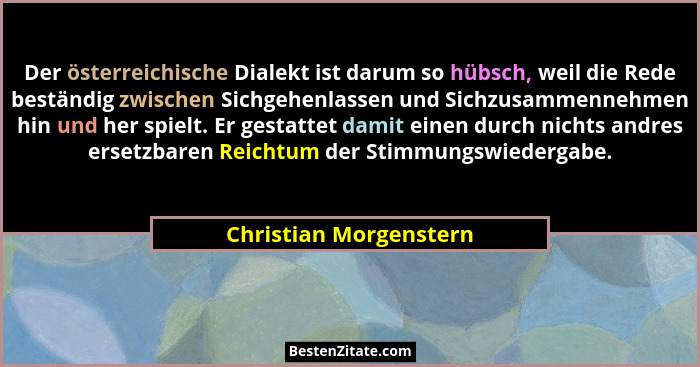 Der österreichische Dialekt ist darum so hübsch, weil die Rede beständig zwischen Sichgehenlassen und Sichzusammennehmen hin und her spielt. Er gestattet damit einen durch nichts andres ersetzbaren Reichtum der Stimmungswiedergabe.