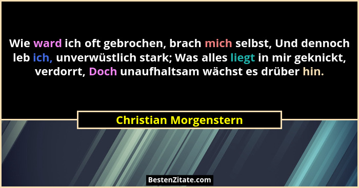 Wie ward ich oft gebrochen, brach mich selbst, Und dennoch leb ich, unverwüstlich stark; Was alles liegt in mir geknickt, verdorrt, Doch unaufhaltsam wächst es drüber hin.