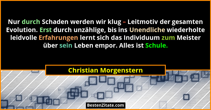 Nur durch Schaden werden wir klug – Leitmotiv der gesamten Evolution. Erst durch unzählige, bis ins Unendliche wiederholte leidvolle Erfahrungen lernt sich das Individuum zum Meister über sein Leben empor. Alles ist Schule.