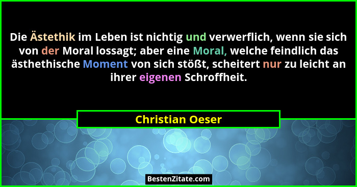 Die Ästethik im Leben ist nichtig und verwerflich, wenn sie sich von der Moral lossagt; aber eine Moral, welche feindlich das ästhethische Moment von sich stößt, scheitert nur zu leicht an ihrer eigenen Schroffheit.