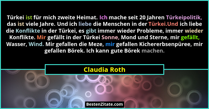 Türkei ist für mich zweite Heimat. Ich mache seit 20 Jahren Türkeipolitik, das ist viele Jahre. Und ich liebe die Menschen in der Türkei.Und ich liebe die Konflikte in der Türkei, es gibt immer wieder Probleme, immer wieder Konflikte. Mir gefällt in der Türkei Sonne, Mond und Sterne, mir gefällt, Wasser, Wind. Mir gefallen die Meze, mir gefallen Kichererbsenpüree, mir gefallen Börek. Ich kann gute Börek machen.