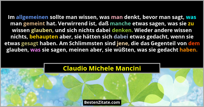 Im allgemeinen sollte man wissen, was man denkt, bevor man sagt, was man gemeint hat. Verwirrend ist, daß manche etwas sagen, was sie zu wissen glauben, und sich nichts dabei denken. Wieder andere wissen nichts, behaupten aber, sie hätten sich dabei etwas gedacht, wenn sie etwas gesagt haben. Am Schlimmsten sind jene, die das Gegenteil von dem glauben, was sie sagen, meinen aber, sie wüßten, was sie gedacht haben.