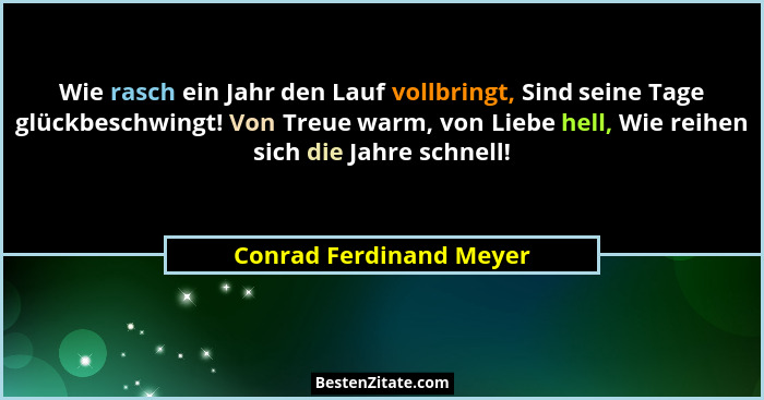 Wie rasch ein Jahr den Lauf vollbringt, Sind seine Tage glückbeschwingt! Von Treue warm, von Liebe hell, Wie reihen sich die Jahre schnell!