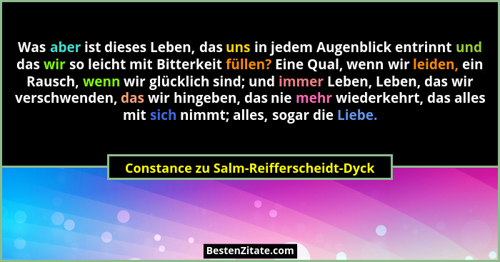 Was aber ist dieses Leben, das uns in jedem Augenblick entrinnt und das wir so leicht mit Bitterkeit füllen? Eine Qual, wenn wir leiden, ein Rausch, wenn wir glücklich sind; und immer Leben, Leben, das wir verschwenden, das wir hingeben, das nie mehr wiederkehrt, das alles mit sich nimmt; alles, sogar die Liebe.