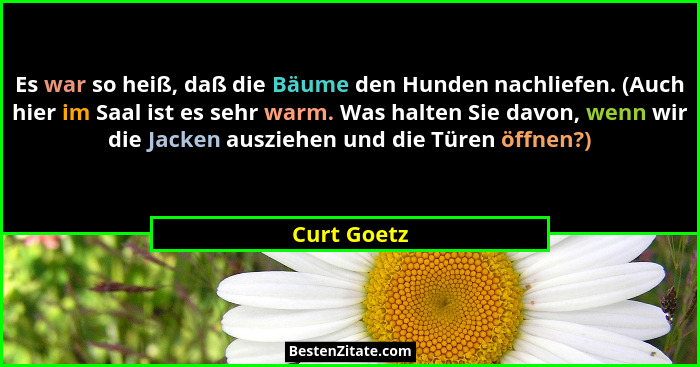 Es war so heiß, daß die Bäume den Hunden nachliefen. (Auch hier im Saal ist es sehr warm. Was halten Sie davon, wenn wir die Jacken ausziehen und die Türen öffnen?)
